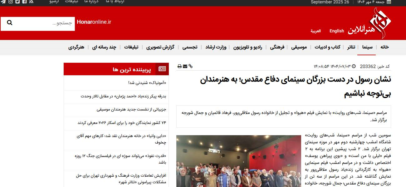 به گزارش پایگاه خبری موزه سینمای ایران، در سومین شب از ویژهبرنامه «شبهای سینما، روایت» که روز چهارشنبه دوم مهرماه برگزار شد، نسخه ترمیم شده فیلم «هیوا» اثر زنده یاد رسول ملاقلیپور و تهیهکنندگی بنیاد سینمایی فارابی و سازمان سینمایی سوره، با حضور حسین طلابیگی، حمید زرگرنژاد، مهاجر توحیدپرست، دانش اقباشاوی، اتابک نادری، امیرحسین شریفی، جلال غفاری، جهانبخش سلطانی، محمدعلی باشهآهنگر، علی غفاری، محسن علیاکبری، ابراهیم اصغری و خانواده معظم شهدا در موزه سینما به نمایش درآمد.