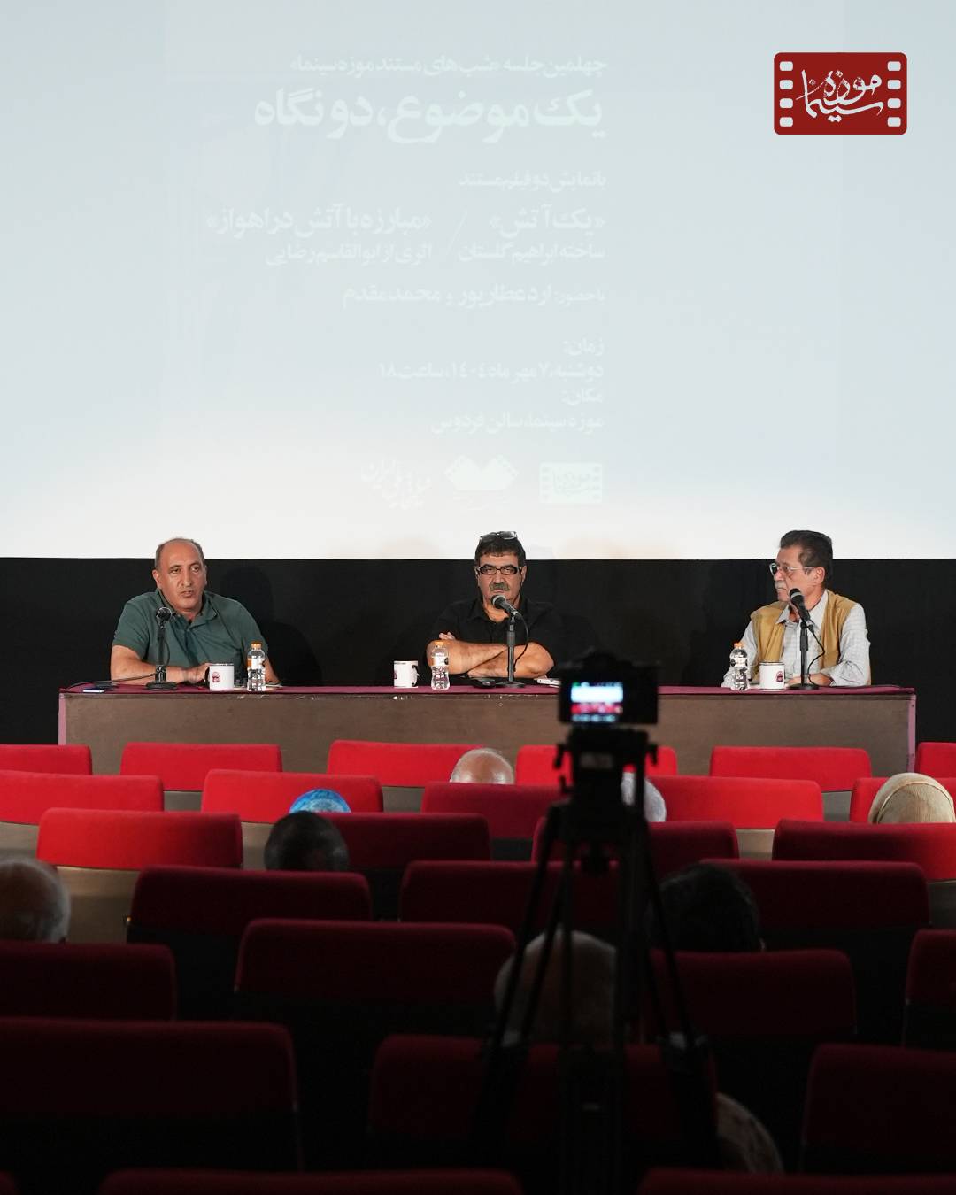 به گزارش پایگاه خبری موزه سینمای ایران، عطار پور، مستند سازسرشناس درابتدای این نشست با بیان اینکه ساخت و نوشته فیلم «مبارزه با آتش در اهواز» بسیار تحت تاثیر یک مستند «یک آتش» گلستان است و حتی ادبیات نگارشی هم به آثار ابراهیم گلستان شباهت دارد، گفت: فیلمبرداری این کار با شاهرخ گلستان بود و در مدت زمان ساخت این اثر ابراهیم گلستان سر صحنه «یک آتش» نبوده و خانم فرخزاد مونتاژ آن را برعهده داشته است اما ردپای هر دو فیلم «یک آتش» و «مبارزه با آتش در اهواز» ساخته ابوالقاسم رضایی بسیار پر رنگ است.این سبک از فیلمسازی بعد از انقلاب ادامه پیدا نکرد اما در زمان خود بسیار خلاقانه و نوآورانه بود.