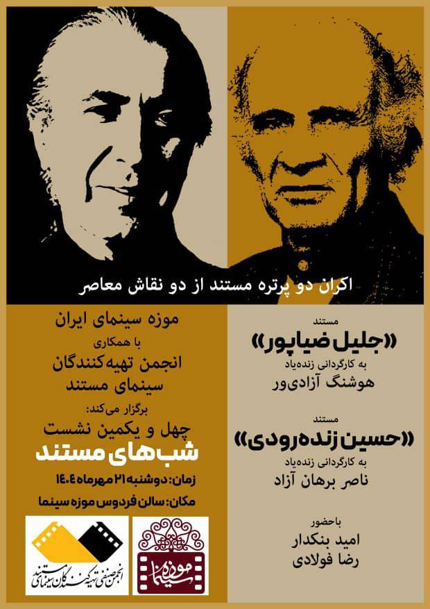 به گزارش پایگاه خبری موزه سینمای ایران، در این برنامه، مستند «حسین زندهرودی» ساختهی ناصر برهانآزاد که در سال ۱۳۴۸ در قالب مجموعهی تلویزیونی «چشمی که میشنود» تولید شده، و مستند «جلیل ضیاءپور» به کارگردانی هوشنگ آزادیور که در سال ۱۳۶۸ برای مجموعهی «آنسوی چشمها» ساخته شده است، نمایش داده خواهند شد.