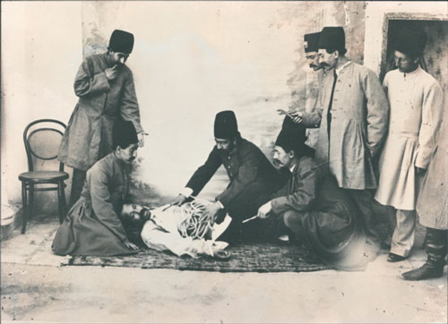پشت صحنه فیلمی که احتمالا توسط میرزاابراهیم خان عکاسباشی در حدود سال ۱۲۷۹شمسی، ساخته شده است. نگاتیو شیشه ای (۱۸*۱۳سانتی متر) در آلبومخانه کاخ گلستان نگاهداری می شود.